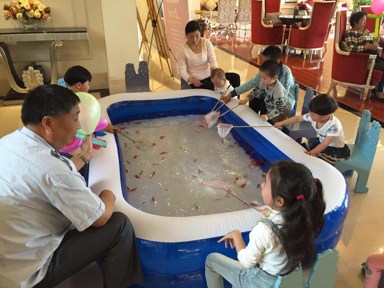 另一邊是充滿童趣的撈金魚現場,百余條活靈活現的小金魚游動其中,覓食玩耍;顒蝇F場,父子、爺孫、母子齊上陣,在與金魚的追逐嬉鬧中,溫馨的純真畫面油然而生。