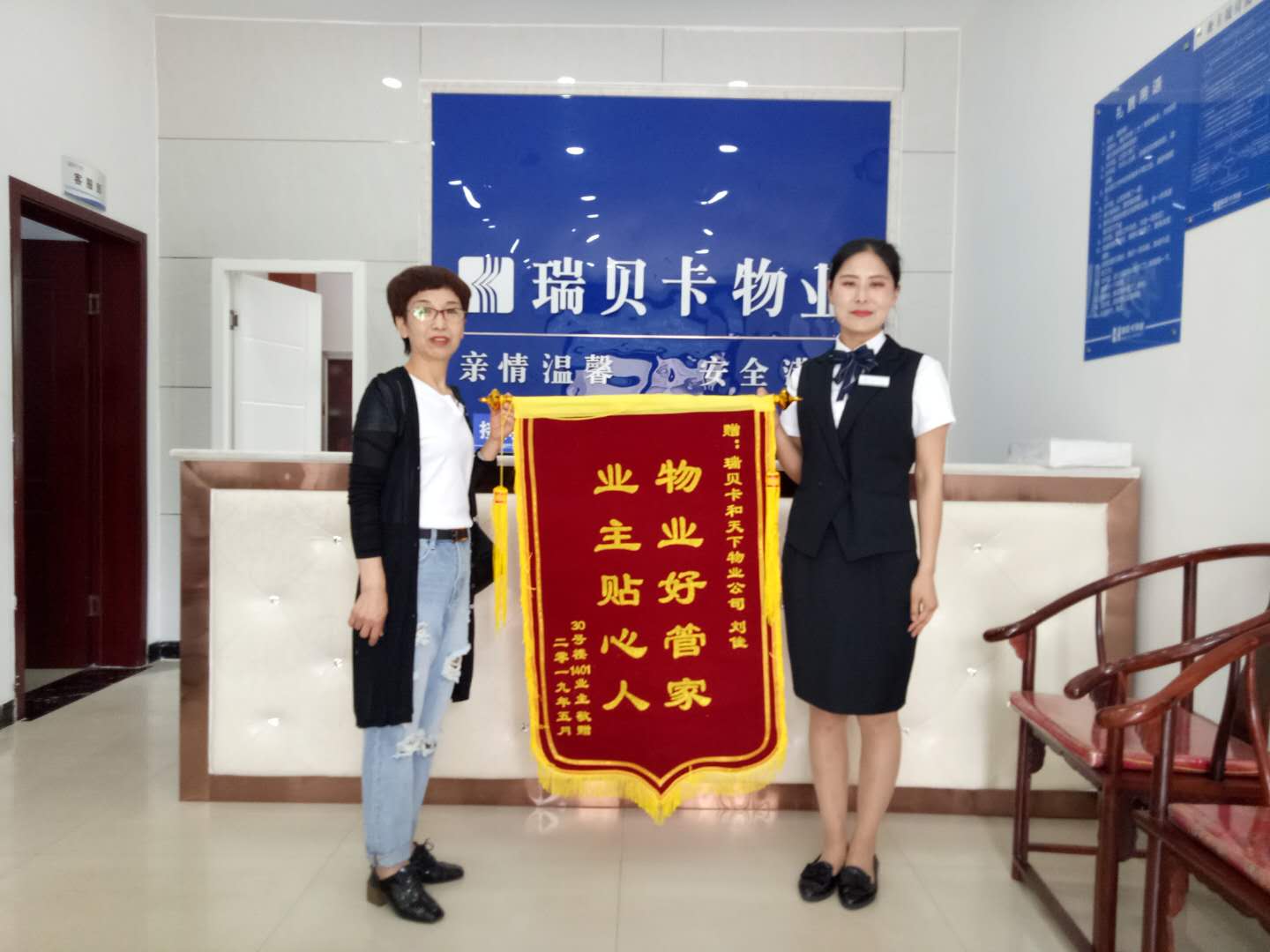 5月18日上午,和天下小區30號樓業主王女士將一面鐫刻有“物業好管家、業主貼心人”的錦旗送到了小區物業服務中心,向盡職盡責為業主服務的客服管家劉佳表示感謝。