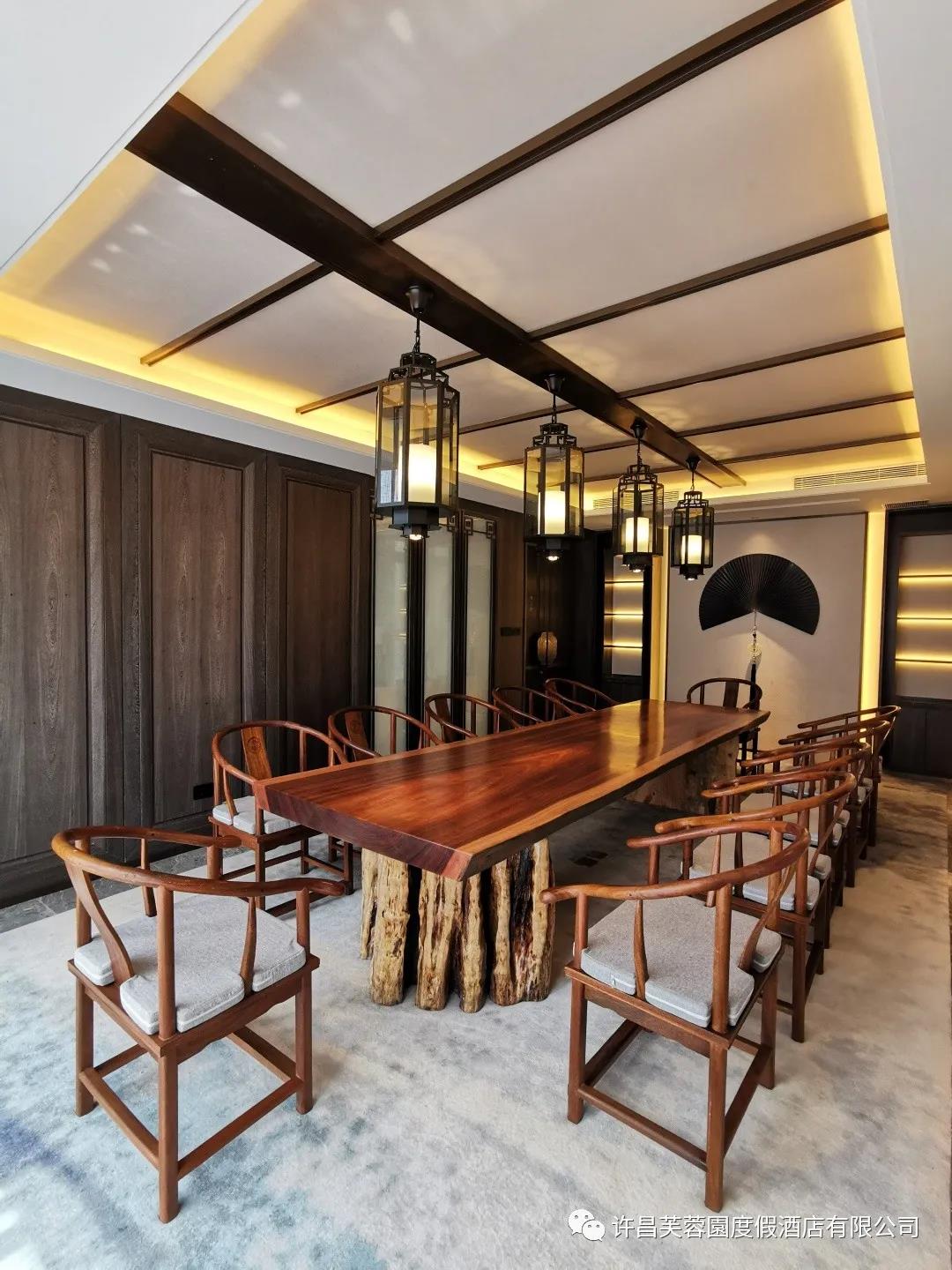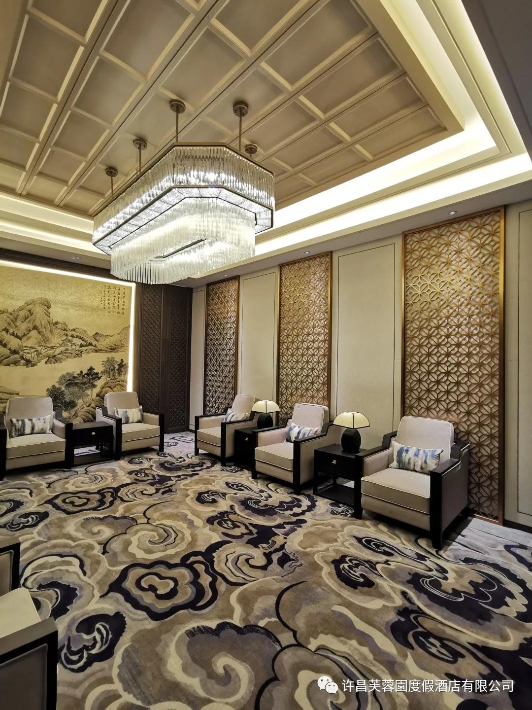 檏園一樓設有會見廳一間,可容納8-10人。藍白祥云地毯、山水畫、水晶吊燈、鏤空屏風等元素與樸素中式沙發椅的組合,是簡潔與復雜的巧妙融合,體現了莊重與優雅的雙重氣質。