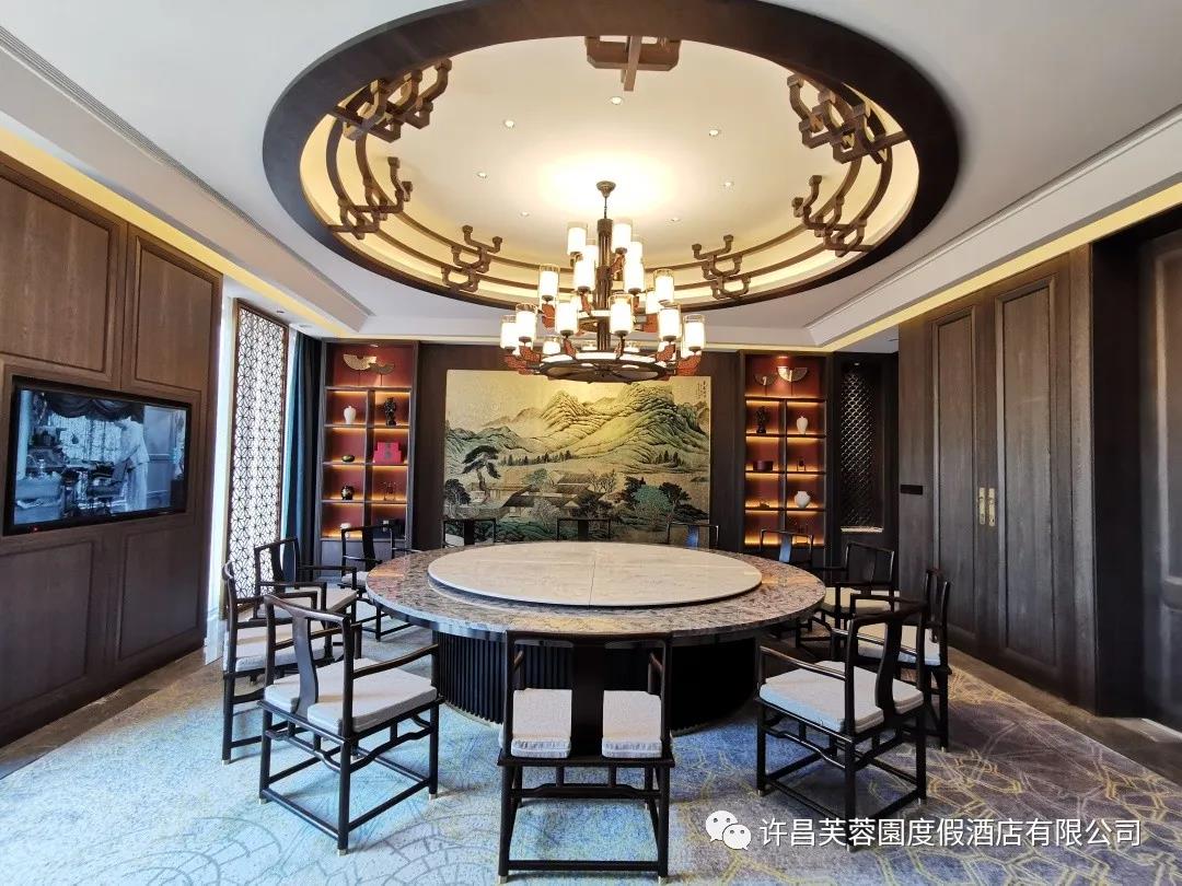 位于檏園一樓,可容納12-14人就餐。格調雅致,古色古香,幾乎占據整面墻的背景畫,名為“靈泉瑞溢”,乃許昌古十景之一。實木餐椅搭配大理石餐桌,柔和石材的硬朗,展現東方文化的內斂氣息,一如中國的飲食文化,深厚廣博,暢神怡情。