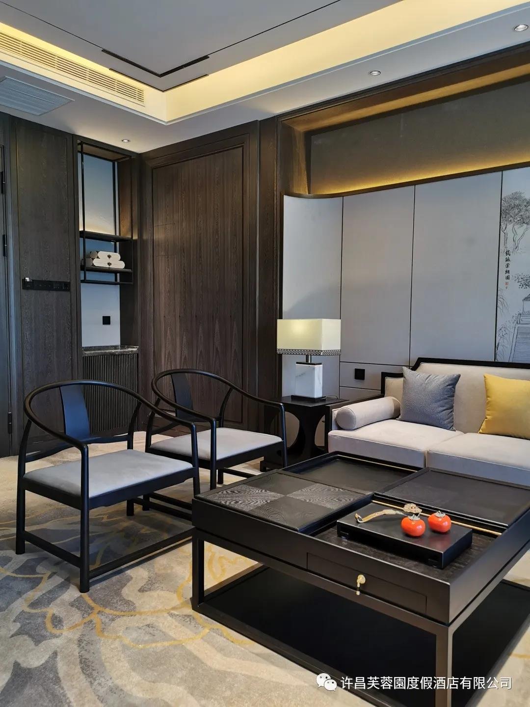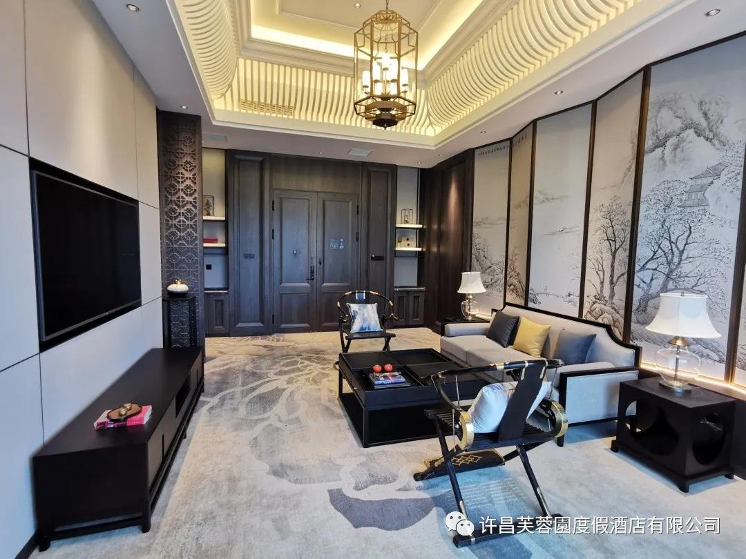 房間以深木色為基礎色調,搭配水墨地毯清新雅致。選取“許昌古十景”為床頭背景畫,簡約宮廷床頭吊燈、30厘米高檔記憶棉床墊、70寸液晶電視、三分離衛生間,功能獨立互不干擾,盡情享受。