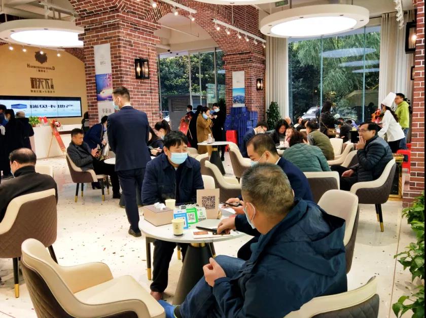 早上08:00,室外氣溫驟降,寒風攜帶細雨,和天下展廳內鮮花簇擁、賓客滿座,寒冷的天氣并未阻擋瑞貝卡客戶翹首以盼的熱情。簽到區、休息區、沙盤區人聲鼎沸,氣氛火熱。