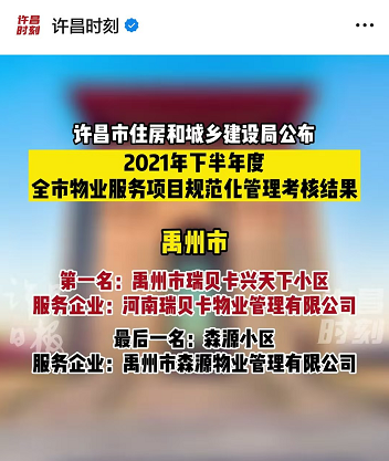 2月28日,許昌市2021年下半年物業服務項目規范化管理考核排名出爐,禹州瑞貝卡興天下在禹州市100多個物業小區中名列第一。