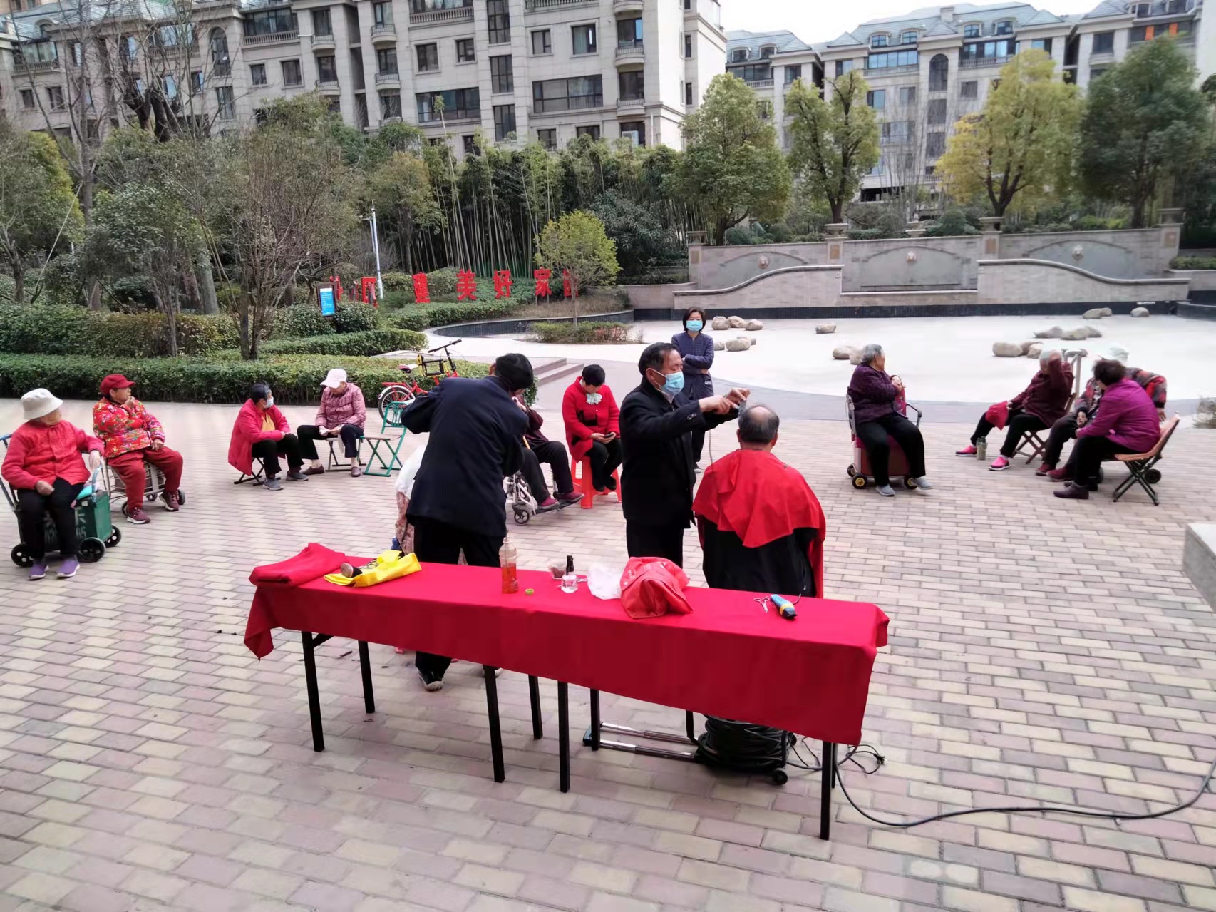 “阿姨,您看這個發型如何?”“張大爺,理個寸頭,可以嗎?”理發張師傅、李師傅,邊理邊詢問業主對發型的要求,熟練地為業主理發。