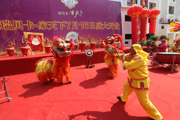上午9點30分,參加開盤儀式的相關領導、嘉賓和業主開始陸續簽到。10點整,一群生龍活虎的雄獅身披彩衣,活潑壯勇;一群美麗的姑娘,揮動玉臂,敲響水鼓,一起舞動起瑞貝卡·家天下對未來、對業主最真摯的祝福,也敲開了襄縣瑞貝卡·家天下開盤儀式的盛典。