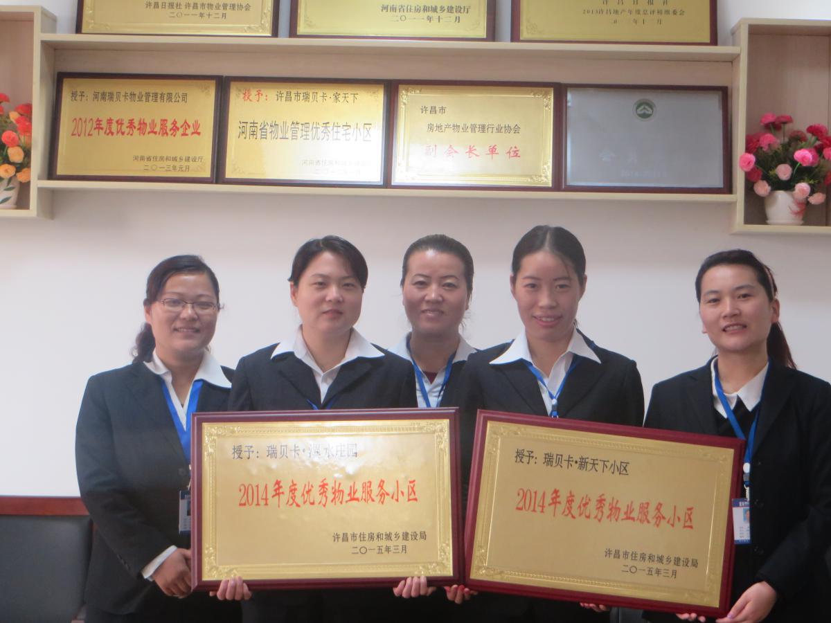 4月22日,瑞貝卡物業從市住建局將雙雙獲得許昌市“2014年度優秀物業服務小區”的潩水莊園、許昌新天下獎牌領回,該公司員工紛紛與之合影,喜悅之情溢于言表。